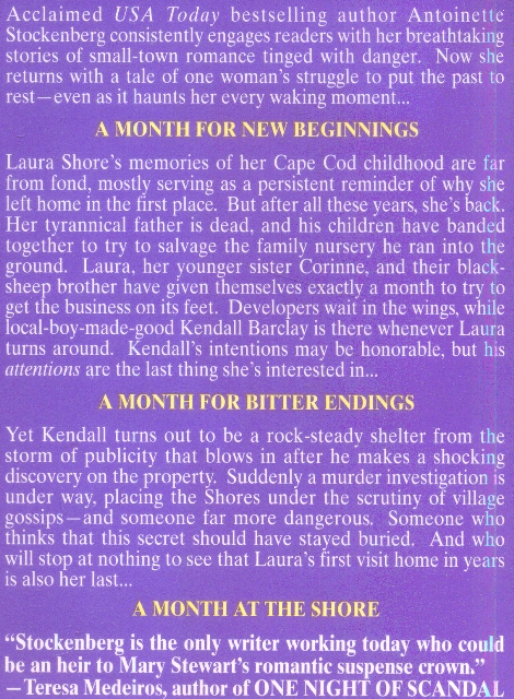 Acclaimed USA Today bestselling author Antoinette Stockenberg consistently engages readers with her breathtaking stories of small-town romance tinged with danger. Now she returns with a tale of one woman's struggle to put the past to rest-even as it haunts her every waking moment... A Month for New Beginnings Laura Shore's memories of her Cape Cod childhood are far from fond, mostly serving as a persistent reminder of why she left home in the first place. But now she's back. Her tyrannical father is dead, and his children have banded together to try to salvage the family nursery he ran into the ground. Laura, her younger sister Corinne, and their black-sheep brother, Snack, have given themselves exactly a month to try to get the business on its feet. Developers wait in the wings, eager to purchase the property, while local-boy-made-good Kendall Barclay is there whenever Laura turns around. Kendall's intentions may be honorable, but his attentions are the last thing she's interested in... A Month for Bitter Endings Yet Kendall turns out to be a rock-steady shelter from the storm of publicity that blows in after he makes a shocking discovery on the property. Suddenly a murder investigation is underway, placing the Shores under the scrutiny of village gossips--and someone far more dangerous. Someone who thinks that this secret should have stayed buried. And who will stop at nothing to see that Laura's first visit home in years is also her last... A Month At the Shore