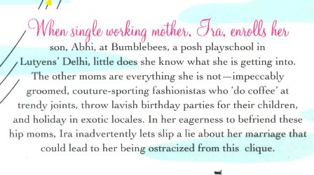 When single working mother, Ira, enrolls her son, Abhi, at Bumblebees, a posh playschool in Lutyens Delhi, little does she know what she is getting into. The other moms are everything she is not impeccably groomed, couture sporting fashionistas who do coffee at trendy joints, throw lavish birthday parties for their children and holiday in exotic locales. In her eagerness to befriend these hip moms, Ira inadvertently lets slip a lie about her marriage that could lead to her being ostracized from this clique. When the dashing Vasu comes back into her life, Ira asks him to pose as her fake husband to help her save face before these women. But will her lie be found out? Will Ira and Vasu part ways or embark on a new beginning together? Replete with memorable characters, Mom in the City is an intimate, humorous and poignant story about contemporary motherhood, love and life in India. The first of its kind in the Indian mom lit genre.