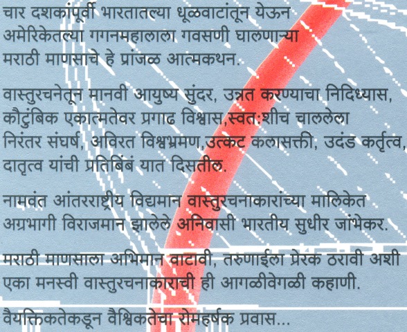 चार दशकांपूर्वी भारतातल्या धूळवाटांतून येऊन अमेरिकेतल्या गगनमहलाला गवसणी घालणाऱ्या मराठी माणसाचे हे प्रांजळ आत्मकथन. वास्तुरचनेतून मानवी आयुष्य सुंदर, उन्नत करण्याचा निदिध्यास, कौटुंबिक एकात्मतेवर प्रगाढ़ विश्वास, स्वतःशीच चाललेला निरंतर संघर्ष अविरत विश्वभ्रमण उत्कट कलासक्ती, उदंड कर्तुत्व दातृत्व यांची प्रतिबिंबं यात दिसतील. नामवंत आंतरराष्ट्रिय विद्यमान वास्तुरचनाकारांच्या मालिकेत अग्रभागी विराजमान झालेले अनिवासी भारतीय सुधीर जांभेकर. मराठी माणसाला अभिमान वाटावी, तरुणाईला प्रेरक ठरावी अशी एका मनस्वी वास्तुरचनाकाराची ही आगळीवेगळी कहाणी. वैयक्तिकतेकडून वैश्विकतेचा रोमहर्षक प्रवास...