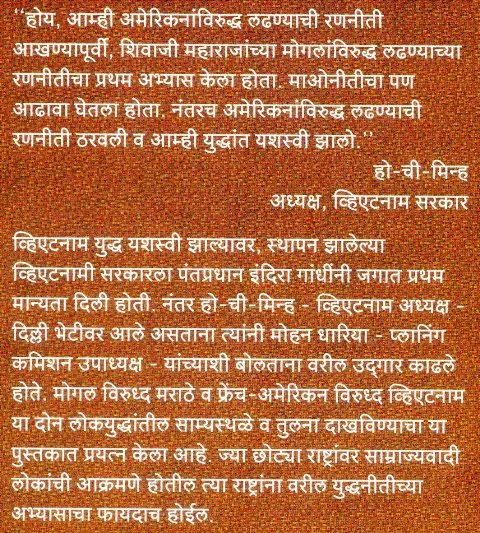 व्हिएतनाम युद्ध यशस्वी झाल्यावर, स्थापन झालेल्या व्हिएतनामी सरकारला पंतप्रधान इंदिरा गांधींनी जगात प्रथम मान्यता दिली होती. नंतर हो-ची-मिन्ह व्हिएतनाम अध्यक्ष भेटीवर आले असताना त्यांनी मोहन धारिया - प्लानिंग कमिशन उपाध्यक्ष यांच्याशी बोलताना वरील उद्गार काढले होते. मोगल विरुद्ध मराठे व फ्रेंच-अमेरिकन विरुद्ध व्हिएतनाम या दोन लोकयुद्धांतील साम्यस्थळे व तुलना दाखविण्याचा या पुस्तकात प्रयत्न केला आहे. ज्या छोट्या राष्ट्रांवर साम्राज्यवादी लोकांची आक्रमणे होतील त्या राष्ट्रांना वरील युद्धनीतीच्या अभ्यासाचा फायदाच होईल.