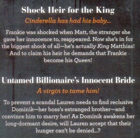 Shock Heir for the King Cinderella had his baby… Frankie is shocked when Matt, the stranger she gave her innocence to, reappears. Now she’s in for the biggest shock of all―he’s actually King Matthias! And to claim his heir, he demands Frankie become his queen! Untamed Billionaire’s Innocent Bride A virgin to tame him! To prevent a scandal, Lauren needs to find reclusive Dominik―her boss’s estranged brother―and convince him to marry her! As Dominik awakens her long-dormant desire, will Lauren accept that their hunger can’t be denied…?