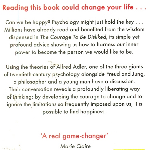 he Courage to be Disliked shows you how to unlock the power within yourself to become your best and truest self, change your future and find lasting happiness. Using the theories of Alfred Adler, one of the three giants of 19th century psychology alongside Freud and Jung, the authors explain how we are all free to determine our own future free of the shackles of past experiences, doubts and the expectations of others. It's a philosophy that's profoundly liberating, allowing us to develop the courage to change, and to ignore the limitations that we and those around us can place on ourselves. The result is a book that is both highly accessible and profound in its importance. Millions have already read and benefited from its wisdom. Now that The Courage to be Disliked has been published for the first time in English, so can you.