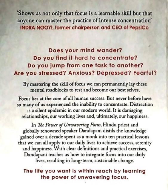 ACHIEVE YOUR GOALS BY LEARNING TO FOCUS. Focus can be learned and improved with practice, just like learning to read or write. Focus is at the core of all human success, yet we are constantly distracted. Distraction is damaging relationships, our working lives and our happiness. Whether you're seeking to improve yourself as a team member or a leader, a partner or a parent, a student or a teacher, this book will help you learn how to focus and in doing so, dramatically improve your productivity, relationships, mental health, happiness and your ability to achieve your life goals. Drawing on ancient Hindu monastic tradition, Dandapani shows us in this ten-step guide that concentration is a skill we can learn and improve with practice.