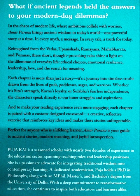 What if ancient legends held the answers to your modern-day dilemmas? In the chaos of modern life, where ambitions collide with worries, Amar Purana brings ancient wisdom to today’s world—one powerful story at a time. In every myth, a message. In every tale, a truth for today. Reimagined from the Vedas, Upanishads, Ramayana, Mahabharata, and Puranas, these short, thought-provoking tales shine a light on the dilemmas of everyday life: ethical choices, emotional resilience, leadership, love, and the search for meaning. Each chapter is more than just a story—it’s a journey into timeless truths drawn from the lives of gods, goddesses, sages, and warriors. Whether it’s Sita's strength, Karna's loyalty, or Sulabha’s fearless independence, the characters speak directly to our inner struggles and aspirations. And to make your reading experience even more engaging, each chapter is paired with a custom-designed crossword—a creative, reflective exercise that reinforces key ideas and makes these stories unforgettable. Perfect for anyone who is a lifelong learner, Amar Purana is your guide to ancient stories, modern meaning, and joyful introspection.