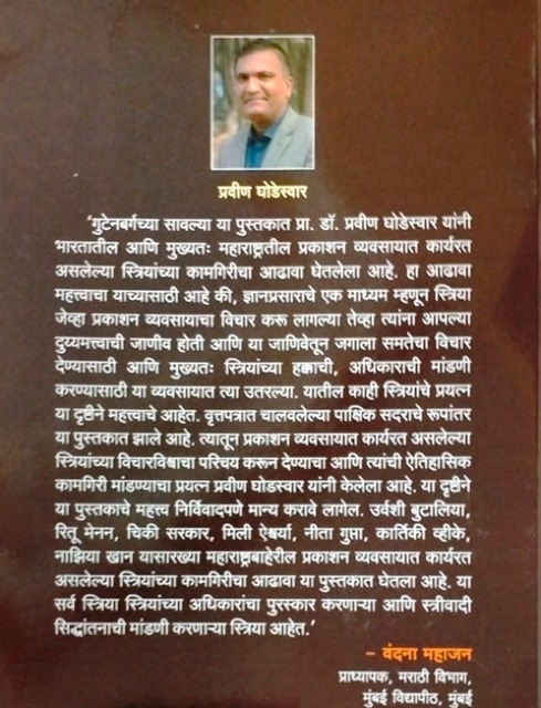 'गुटेनबर्गच्या सावल्या या पुस्तकात प्रा. डॉ. प्रवीण घोडेस्वार यांनी भारतातील आणि मुख्यतः महाराष्ट्रातील प्रकाशन व्यवसायात कार्यरत असलेल्या स्त्रियांच्या कामगिरीचा आढावा घेतलेला आहे. हा आढावा महत्त्वाचा याच्यासाठी आहे की, ज्ञानप्रसाराचे एक माध्यम म्हणून स्त्रिया जेव्हा प्रकाशन व्यवसायाचा विचार करू लागल्या तेव्हा त्यांना आपल्या दुय्यमत्त्वाची जाणीव होती आणि या जाणिवेतून जगाला समतेचा विचार देण्यासाठी आणि मुख्यतः स्त्रियांच्या हक्काची, अधिकाराची मांडणी करण्यासाठी या व्यवसायात त्या उतरल्या. यातील काही स्त्रियांचे प्रयत्न या दृष्टीने महत्त्वाचे आहेत. वृत्तपत्रात चालवलेल्या पाक्षिक सदराचे रूपांतर या पुस्तकात झाले आहे. त्यातून प्रकाशन व्यवसायात कार्यरत असलेल्या स्त्रियांच्या विचारविश्वाचा परिचय करून देण्याचा आणि त्यांची ऐतिहासिक कामगिरी मांडण्याचा प्रयत्न प्रवीण घोडस्वार यांनी केलेला आहे. या दृष्टीने या पुस्तकाचे महत्त्व निर्विवादपणे मान्य करावे लागेल. उर्वशी बुटालिया, रितू मेनन, चिकी सरकार, मिली ऐश्वर्या, नीता गुप्ता, कार्तिकी व्हीके, नाझिया खान यासारख्या महाराष्ट्राबाहेरील प्रकाशन व्यवसायात कार्यरत असलेल्या स्त्रियांच्या कामगिरीचा आढावा या पुस्तकात घेतला आहे. या सर्व स्त्रिया स्त्रियांच्या अधिकारांचा पुरस्कार करणाऱ्या आणि स्त्रीवादी सिद्धांतनाची मांडणी करणाऱ्या स्त्रिया आहेत. ' --वंदना महाजन प्राध्यापक, मराठी विभाग, मुंबई विद्यापीठ, मुंबई