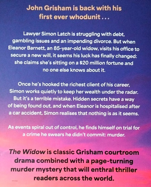 The new incredible legal thriller from John Grisham. She needs a lawyer. He needs a payday. Simon Latch is a small-town lawyer struggling with debt, gambling issues and an impending divorce. But when Eleanor Barnett, an 85-year-old widow, visits his office to secure a new will, it seems his luck has finally changed: she claims she's sitting on a $20 million fortune and no one else knows about it. She could be the ticket to his fortune. Once he's hooked the richest client of his career, Simon works quietly to keep her wealth under the radar, even from his own assistant. But there are complications: other lawyers are circling his client like vultures. But when she is hospitalised after a car accident, Eleanor's story begins to crack. Simon realises that nothing is as it seems. And as events spiral out of control, he finds himself on trial for a crime he swears he didn't commit: murder. The Widow is classic Grisham courtroom drama combined with a confounding murder mystery that will enthral his legion of fans.