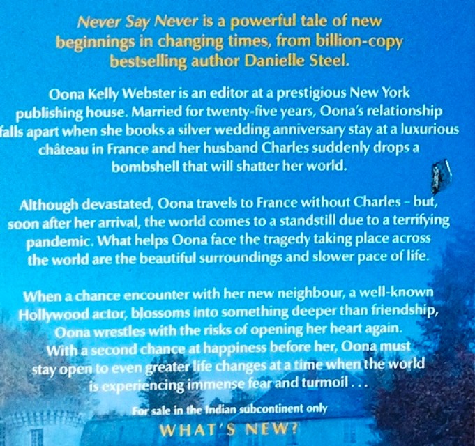 Never Say Never, the story of a woman who finds her life turned upside down while living temporarily in the French countryside, is an enthralling testament to new beginnings from billion-copy bestselling author Danielle Steel. Oona Kelly Webster is an editor at a prestigious New York publishing house. Married with two children, her twenty-five-year relationship falls apart when she books a silver wedding anniversary getaway at a luxurious château in France and her husband Charles suddenly drops a bombshell which will shatter her carefully built world. Although devastated, Oona decides to travel to France without Charles, but soon after her arrival in the charming village of Milly-la-Forêt, the world comes to a standstill due to a terrifying pandemic and all travel is forbidden. Isolated and fearful, Oona then receives another shock when she discovers her job has been made redundant. The only thing which helps her to face the tragedy taking place across the world is that she can remain in France, where the beautiful surroundings and slower pace of life will slowly begin to heal her. And when a chance encounter with her new neighbour, a well-known Hollywood actor who is also stranded far from home, blossoms into something deeper than friendship, Oona wrestles with the risks of opening her heart again― especially to a younger, very famous man who has two young children grieving for their mother. With a second chance at happiness before her, Oona must be brave enough to stay open to even greater life changes at a time when the world is experiencing great fear and turmoil . . .