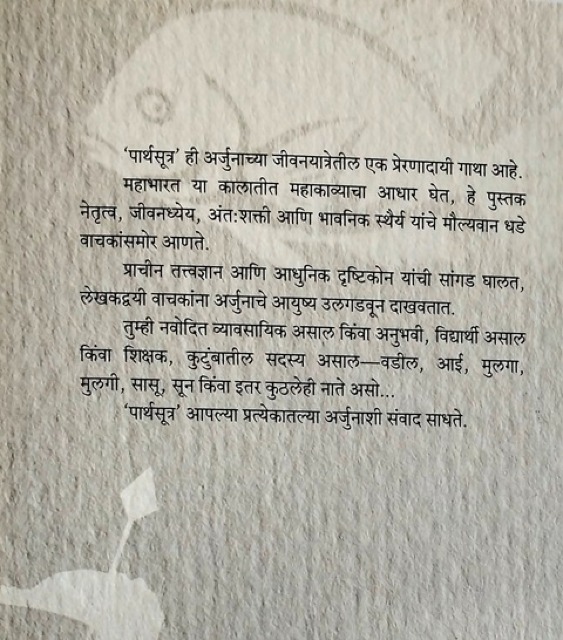 पार्थसूत्र' ही अर्जुनाच्या जीवनयात्रेतील एक प्रेरणादायी गाथा आहे. महाभारत या कालातीत महाकाव्याचा आधार घेत, हे पुस्तक नेतृत्व, जीवनध्येय, अंतःशक्ती आणि भावनिक स्थैर्य यांचे मौल्यवान धडे वाचकांसमोर आणते. प्राचीन तत्त्वज्ञान आणि आधुनिक दृष्टिकोन यांची सांगड घालत, लेखकद्वयी वाचकांना अर्जुनाचे आयुष्य उलगडवून दाखवतात. तुम्ही नवोदित व्यावसायिक असाल किंवा अनुभवी, विद्यार्थी असाल किंवा शिक्षक, कुटुंबातील सदस्य असाल - वडील, आई, मुलगा, मुलगी, सासू, सून किंवा इतर कुठलेही नाते असो... 'पार्थसूत्र' आपल्या प्रत्येकातल्या अर्जुनाशी संवाद साधते.