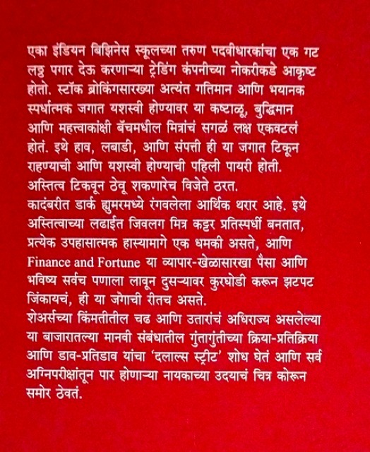 "एका इंडियन बिझिनेस स्कूलच्या तरुण पदवीधारकांचा गट गलेलठ्ठ पगार देऊ करणार्या ट्रेडिंग कंपनीच्या नोकरीकडे आकृष्ट होतो. स्टॉक ब्रोकिंगसारख्या अत्यंत गतिमान आणि भयानक स्पर्धात्मक जगात यशस्वी होण्याकडे या बॅचमधील मित्रांचं सगळं लक्ष एकवटलेलं असतं. हाव, लबाडी, आणि संपत्ती ही या जगात टिकून राहण्याची आणि यशस्वी होण्याची पहिली पायरी असते. जे अस्तित्व टिकवून ठेऊ शकत, ते विजेते ठरत. हा आर्थिक थरार या कादंबरीत डार्क ह्युमरमध्ये रंगवलेला अनुभवायला मिळतो. इथे अस्तित्वाच्या लढाईत जिवलग मित्र कट्टर प्रतिस्पर्धी बनतात, प्रत्येक उपहासात्मक हास्यामागे एक धमकी असते, आणि व्यापार-खेळासारखा पैसा आणि भविष्य सर्वच पणाला लावून दुसर्यावर कुरघोडी करून झटपट जिंकायचं, ही या जगाची रीतच असते. शेअर्सच्या किंमतीतील चढ आणि उतारांचं अधिराज्य असलेल्या या बाजारातल्या मानवी संबंधातील गुंतागुंतीच्या क्रिया-प्रतिक्रिया आणि डाव-प्रतिडाव यांचा ‘दलाल्स स्ट्रीट’ शोध घेतं आणि सर्व अग्निपरीक्षांतून पार होणार्या नायकाच्या उदयाचं चित्र कोरून समोर ठेवतं. "