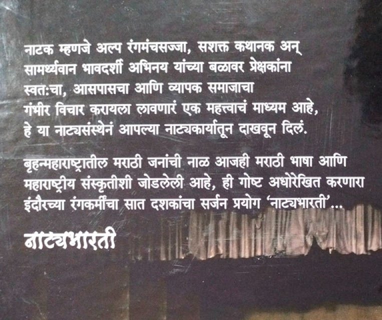 नाटक म्हणजे अल्प रंगमंचसज्जा, सशक्त कथानक अन् सामर्थ्यवान भावदर्शी अभिनय यांच्या बळावर प्रेक्षकांना स्वतःचा, आसपासचा आणि व्यापक समाजाचा गंभीर विचार करायला लावणारं एक महत्त्वाचं माध्यम आहे, हे या नाट्यसंस्थेनं आपल्या नाट्यकार्यातून दाखवून दिलं. बृहन्महाराष्ट्रातील मराठी जनांची नाळ आजही मराठी भाषा आणि महाराष्ट्रीय संस्कृतीशी जोडलेली आहे, ही गोष्ट अधोरेखित करणारा इंदौरच्या रंगकर्मीचा सात दशकांचा सर्जन प्रयोग 'नाट्यभारती'.