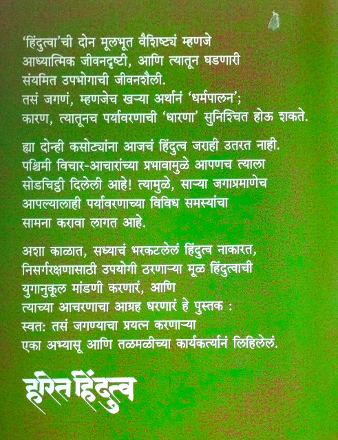 हिंदुत्वा'ची दोन मूलभूत वैशिष्ट्यं म्हणजे आध्यात्मिक जीवनदृष्टी, आणि त्यातून घडणारी संयमित उपभोगाची जीवनशैली. तसं जगणं, म्हणजेच खऱ्या अर्थानं 'धर्मपालन'; कारण, त्यातूनच पर्यावरणाची 'धारणा' सुनिश्चित होऊ शकते. पश्चिमी विचार-आचारांच्या प्रभावामुळे आपणच त्याला सोडचिट्ठी दिलेली आहे! त्यामुळे, साऱ्या जगाप्रमाणेच आपल्यालाही पर्यावरणाच्या विविध समस्यांचा सामना करावा लागत आहे. अशा काळात, सध्याचं भरकटलेलं हिंदुत्व नाकारत, निसर्गरक्षणासाठी उपयोगी ठरणाऱ्या मूळ हिंदुत्वाची युगानुकूल मांडणी करणारं, आणि त्याच्या आचरणाचा आग्रह धरणारं हे पुस्तक : स्वतः तसं जगण्याचा प्रयत्न करणाऱ्या एका अभ्यासू आणि तळमळीच्या कार्यकर्त्यानं लिहिलेलं.