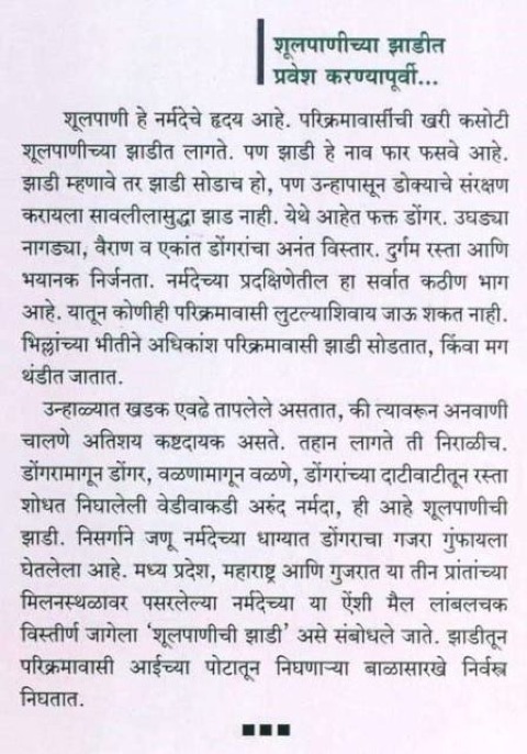 शूलपाणीच्या झाडीत | प्रवेश करण्यापूर्वी... शूलपाणी हे नर्मदेचे हृदय आहे. परिक्रमावासींची खरी कसोटी शूलपाणीच्या झाडीत लागते. पण झाडी हे नाव फार फसवे आहे. झाडी म्हणावे तर झाडी सोडाच हो, पण उन्हापासून डोक्याचे संरक्षण करायला सावलीलासुद्धा झाड नाही. येथे आहेत फक्त डोंगर. उघड्या नागड्या, वैराण व एकांत डोंगरांचा अनंत विस्तार. दुर्गम रस्ता आणि भयानक निर्जनता. नर्मदेच्या प्रदक्षिणेतील हा सर्वात कठीण भाग आहे. यातून कोणीही परिक्रमावासी लुटल्याशिवाय जाऊ शकत नाही. भिल्लांच्या भीतीने अधिकांश परिक्रमावासी झाडी सोडतात, किंवा मग थंडीत जातात. उन्हाळ्यात खडक एवढे तापलेले असतात, की त्यावरून अनवाणी चालणे अतिशय कष्टदायक असते. तहान लागते ती निराळीच. डोंगरामागून डोंगर, वळणामागून वळणे, डोंगरांच्या दाटीवाटीतून रस्ता शोधत निघालेली वेडीवाकडी अरुंद नर्मदा, ही आहे शूलपाणीची झाडी. निसर्गाने जणू नर्मदेच्या धाग्यात डोंगराचा गजरा गुंफायला घेतलेला आहे. मध्य प्रदेश, महाराष्ट्र आणि गुजरात या तीन प्रांतांच्या मिलनस्थळावर पसरलेल्या नर्मदेच्या या ऐंशी मैल लांबलचक विस्तीर्ण जागेला 'शूलपाणीची झाडी' असे संबोधले जाते.