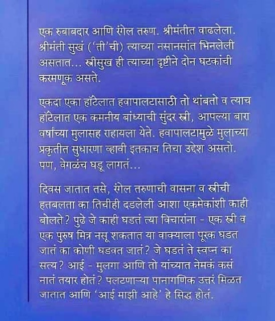 एक रंगेल तरुण श्रीमंतीत वाढलेला. श्रीमंती सुखं (`ती’ची) त्याच्या नसानसांत भिनलेली असतात... स्त्रीसुख ही त्याच्या दृष्टीने दोन घटकांची करमणूक असते. पावित्र्य, शील, चारित्र्य, सामाजिक आणि कौटुंबिक चौकटीतले संकेत, शिष्टाचार, नातेसंबंध या गोष्टींशी सदानंदाला काहीही देणंघेणं नसतं. सुगंधी फुलाचा वास घेऊन ते चुरगाळून टाकायचं एवढंच त्याला माहीत असतं. हवापालटासाठी थांबलेल्या हॉटेलात, एक कमनीय बांध्याची सुंदर स्त्री, आपल्या बारा वर्षांच्या मुलासह राहायला येते. हवापालटामुळे मुलाच्या प्रकृतीत सुधारणा व्हावी इतकाच तिचा उद्देश असतो. पण, वेगळंच घडू लागतं... रंगेल तरुणाची वासना व स्त्रीची हतबलता का दडलेली आशा? एक स्त्री – एक पुरुष मित्र नसू शकतात या वाक्याला पुरक असं हळूहळू घडत जातं का कोणी घडवत जातं? जे घडतं ते स्वप्न का सत्य? आई - मुलगा आणि तो यांच्यात नेमकं कसं नातं तयार होतं? या विचारांना पलटणार्‍या पानागणिक उत्तरं मिळत जातात आणि ‘आई माझी आहे’ हे सिद्ध होतं.