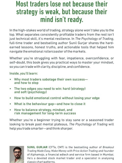 Most traders lose not because their strategy is weak, but because their mind isn’t ready. In the high-stakes world of trading, strategy alone won’t take you to the top. What separates consistently profitable traders from the rest isn’t just technical skill, it’s mental resilience. In The Psychology of Trading, full-time trader and bestselling author Sunil Gurjar shares the hard-earned lessons, honest truths, and actionable tools that helped him navigate the emotional rollercoaster of the markets. Whether you’re struggling with fear, impatience, overconfidence, or self-doubt, this book gives you practical ways to master your mindset, so you can trade with clarity, discipline, and confidence. Inside, you’ll learn: • Why most traders sabotage their own success—and how to stop • The two edges you need to win: hard (strategy) and soft (psychology) • How to build emotional control without losing your edge • What the behaviour gap is—and how to close it • How to balance strategy, mindset, and risk management for long-term success Whether you’re a beginner trying to stay sane or a seasoned trader looking to break past mental plateaus, The Psychology of Trading will help you trade smarter—and think sharper.