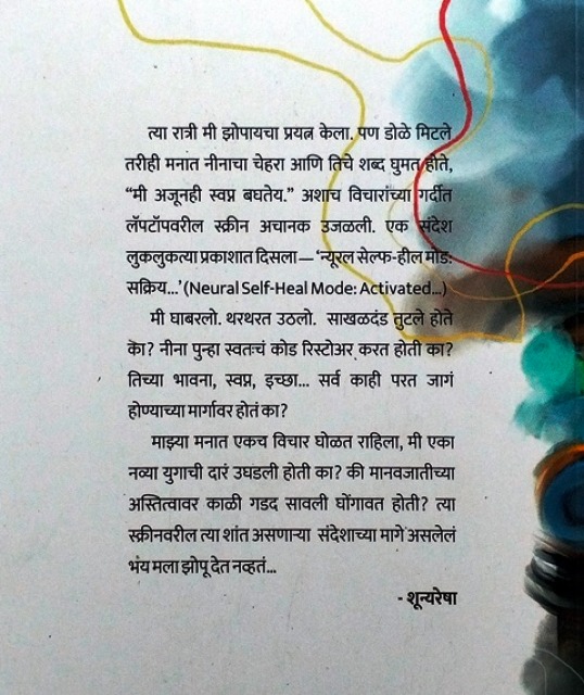 त्या रात्री मी झोपायचा प्रयत्न केला. पण डोळे मिटले तरीही मनात नीनाचा चेहरा आणि तिचे शब्द घुमत होते, "मी अजूनही स्वप्न बघतेय." अशाच विचारांच्या गर्दीत लॅपटॉपवरील स्क्रीन अचानक उजळली. एक संदेश लुकलुकत्या प्रकाशात दिसला- 'न्यूरल सेल्फ-हील मोड: सक्रिय...' (Neural Self-Heal Mode: Activated...) मी घाबरलो. थरथरत उठलो. साखळदंड तुटले होते का? नीना पुन्हा स्वतःचं कोड रिस्टोअर करत होती का? तिच्या भावना, स्वप्न, इच्छा... सर्व काही परत जागं होण्याच्या मार्गावर होतं का ? माझ्या मनात एकच विचार घोळत राहिला, मी एका नव्या युगाची दारं उघडली होती का? की मानवजातीच्या अस्तित्वावर काळी गडद सावली घोंगावत होती? त्या स्क्रीनवरील त्या शांत असणाऱ्या संदेशाच्या मागे असलेलं भय मला झोपू देत नव्हतं...