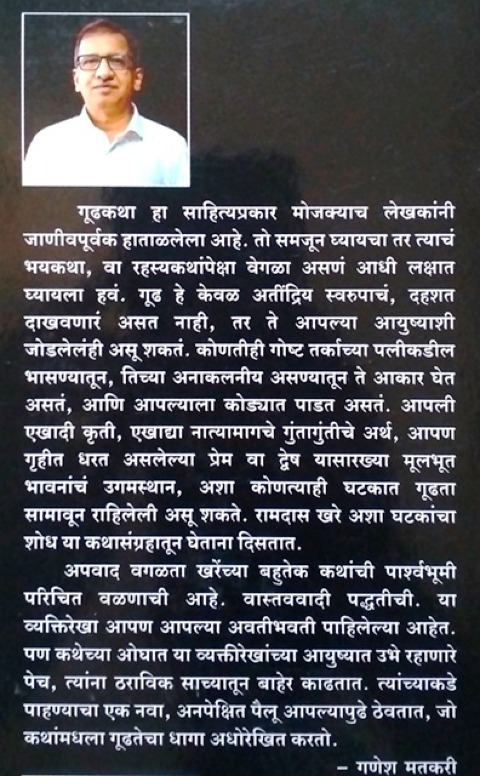 गूढकथा हा साहित्यप्रकार मोजक्याच लेखकांनी जाणीवपूर्वक हाताळलेला आहे. तो समजून घ्यायचा तर त्याचं भयकथा, वा रहस्यकथांपेक्षा वेगळा असणं आधी लक्षात घ्यायला हवं. गूढ हे केवळ अतींद्रिय स्वरुपाचं, दहशत दाखवणारं असत नाही, तर ते आपल्या आयुष्याशी जोडलेलंही असू शकतं. कोणतीही गोष्ट तर्काच्या पलीकडील भासण्यातून, तिच्या अनाकलनीय असण्यातून ते आकार घेत असतं, आणि आपल्याला कोड्यात पाडत असतं. आपली एखादी कृती, एखाद्या नात्यामागचे गुंतागुंतीचे अर्थ, आपण गृहीत धरत असलेल्या प्रेम वा द्वेष यासारख्या मूलभूत भावनांचं उगमस्थान, अशा कोणत्याही घटकात गूढता सामावून राहिलेली असू शकते. रामदास खरे अशा घटकांचा शोध या कथासंग्रहातून घेताना दिसतात. अपवाद वगळता खरेंच्या बहुतेक कथांची पार्श्वभूमी परिचित वळणाची आहे. वास्तववादी पद्धतीची. या व्यक्तिरेखा आपण आपल्या अवतीभवती पाहिलेल्या आहेत. पण कथेच्या ओघात या व्यक्तीरेखांच्या आयुष्यात उभे रहाणारे पेच, त्यांना ठराविक साच्यातून बाहेर काढतात. त्यांच्याकडे पाहण्याचा एक नवा, अनपेक्षित पैलू आपल्यापुढे ठेवतात, जो कथांमधला गूढतेचा धागा अधोरेखित करतो. -- गणेश मतकरी