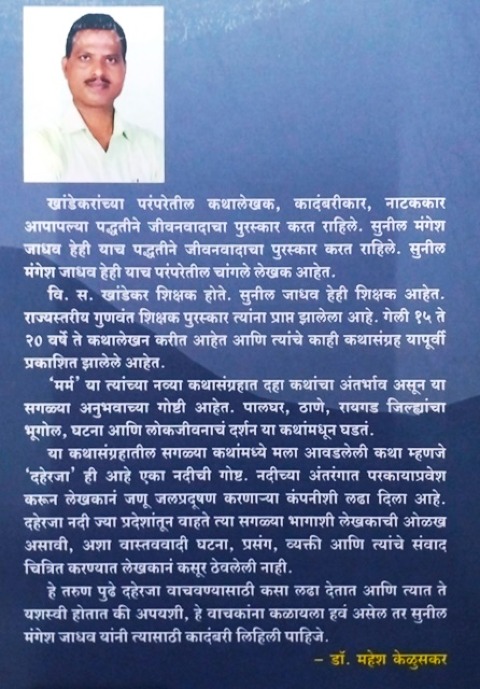 खांडेकरांच्या परंपरेतील कथालेखक, कादंबरीकार, नाटककार आपापल्या पद्धतीने जीवनवादाचा पुरस्कार करत राहिले. सुनील मंगेश जाधव हेही याच पद्धतीने जीवनवादाचा पुरस्कार करत राहिले. सुनील मंगेश जाधव हेही याच परंपरेतील चांगले लेखक आहेत. वि. स. खांडेकर शिक्षक होते. सुनील जाधव हेही शिक्षक आहेत. राज्यस्तरीय गुणवंत शिक्षक पुरस्कार त्यांना प्राप्त झालेला आहे. गेली १५ ते २० वर्षे ते कथालेखन करीत आहेत आणि त्यांचे काही कथासंग्रह यापूर्वी प्रकाशित झालेले आहेत. 'मर्म' या त्यांच्या नव्या कथासंग्रहात दहा कथांचा अंतर्भाव असून या सगळ्या अनुभवाच्या गोष्टी आहेत. पालघर, ठाणे, रायगड जिल्ह्यांचा भूगोल, घटना आणि लोकजीवनाचं दर्शन या कथांमधून घडतं. या कथासंग्रहातील सगळ्या कथांमध्ये मला आवडलेली कथा म्हणजे 'दहेरजा' ही आहे एका नदीची गोष्ट. नदीच्या अंतरंगात परकायाप्रवेश करून लेखकानं जणू जलप्रदूषण करणाऱ्या कंपनीशी लढा दिला आहे. दहेरजा नदी ज्या प्रदेशांतून वाहते त्या सगळ्या भागाशी लेखकाची ओळख असावी, अशा वास्तववादी घटना, प्रसंग, व्यक्ती आणि त्यांचे संवाद चित्रित करण्यात लेखकानं कसूर ठेवलेली नाही. हे तरुण पुढे दहेरजा वाचवण्यासाठी कसा लढा देतात आणि त्यात ते यशस्वी होतात की अपयशी, हे वाचकांना कळायला हवं असेल तर सुनील मंगेश जाधव यांनी त्यासाठी कादंबरी लिहिली पाहिजे. -- डॉ. महेश केळुसकर