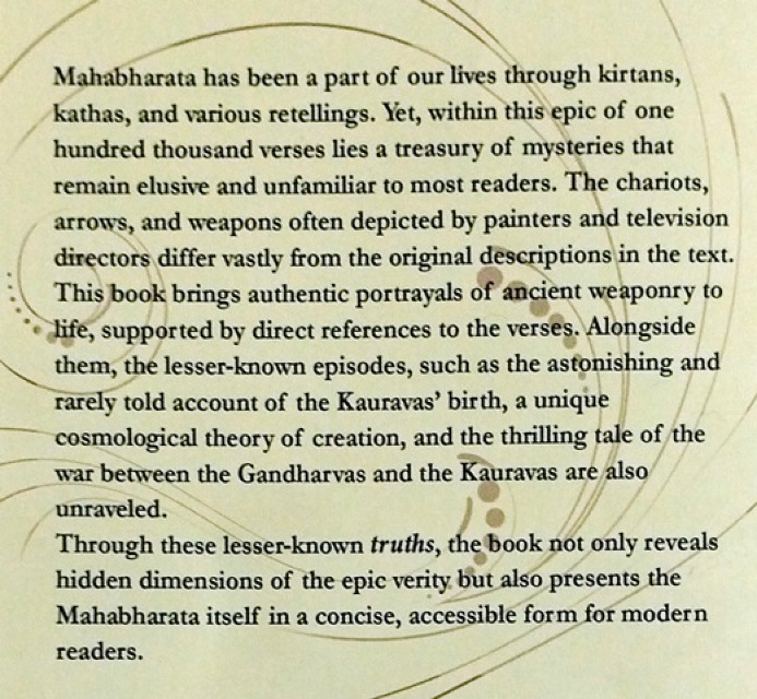 Mahabharata has been a part of our lives through kirtans, kathas, and various retellings. Yet, within this epic of one hundred thousand verses lies a treasury of mysteries that remain elusive and unfamiliar to most readers. The chariots, arrows, and weapons often depicted by painters and television directors differ vastly from the original descriptions in the text. This book brings authentic portrayals of ancient weaponry to life, supported by direct references to the verses. Alongside them, the lesser-known episodes, such as the astonishing and rarely told account of the Kauravas’ birth, a unique cosmological theory of creation, and the thrilling tale of the war between the Gandharvas and the Kauravas are also unraveled. Through these lesser-known truths, the book not only reveals hidden dimensions of the epic verity but also presents the Mahabharata itself in a concise, accessible form for modern readers.