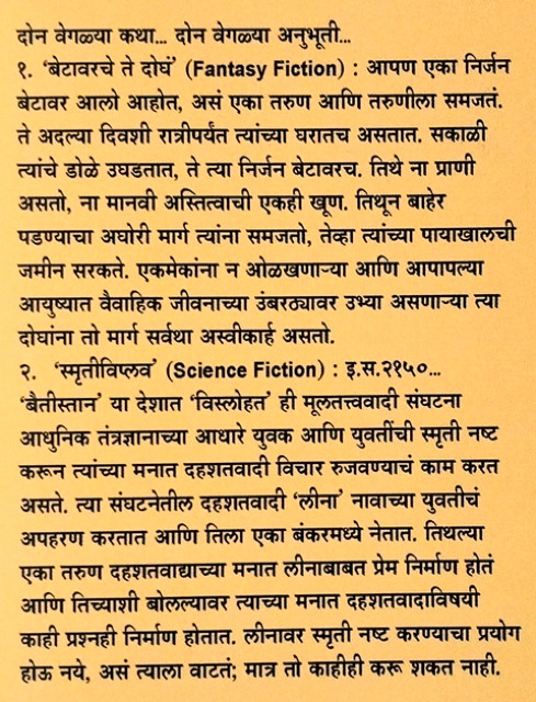 दोन वेगळ्या कथा… दोन वेगळ्या अनुभूती… 1. ‘बेटावरचे ते दोघं’ (Fantasy Fiction) : आपण एका निर्जन बेटावर आलो आहोत, असं एका तरुण आणि तरुणीला समजतं. ते अदल्या दिवशी रात्रीपर्यंत त्यांच्या घरातच असतात. सकाळी त्यांचे डोळे उघडतात, ते त्या निर्जन बेटावरच. तिथे ना प्राणी असतो, ना मानवी अस्तित्वाची एकही खूण. तिथून बाहेर पडण्याचा अघोरी मार्ग त्यांना समजतो, तेव्हा त्यांच्या पायाखालची जमीन सरकते. एकमेकांना न ओळखणाऱ्या आणि आपापल्या आयुष्यात वैवाहिक जीवनाच्या उंबरठ्यावर उभ्या असणाऱ्या त्या दोघांना तो मार्ग सर्वथा अस्वीकार्ह असतो. 2. ‘स्मृतीविप्लव’ (Science Fiction) : इ.स.2150… ‘बैतीस्तान’ या देशात ‘विस्लोहत’ ही मूलतत्त्ववादी संघटना आधुनिक तंत्रज्ञानाच्या आधारे युवक आणि युवतींची स्मृती नष्ट करून त्यांच्या मनात दहशतवादी विचार रुजवण्याचं काम करत असते. त्या संघटनेतील दहशतवादी ‘लीना’ नावाच्या युवतीचं अपहरण करतात आणि तिला एका बंकरमध्ये नेतात. तिथल्या एका तरुण दहशतवाद्याच्या मनात लीनाबाबत प्रेम निर्माण होतं आणि तिच्याशी बोलल्यावर त्याच्या मनात दहशतवादाविषयी काही प्रश्नही निर्माण होतात. लीनावर स्मृती नष्ट करण्याचा प्रयोग होऊ नये, असं त्याला वाटतं; मात्र तो काहीही करू शकत नाही.