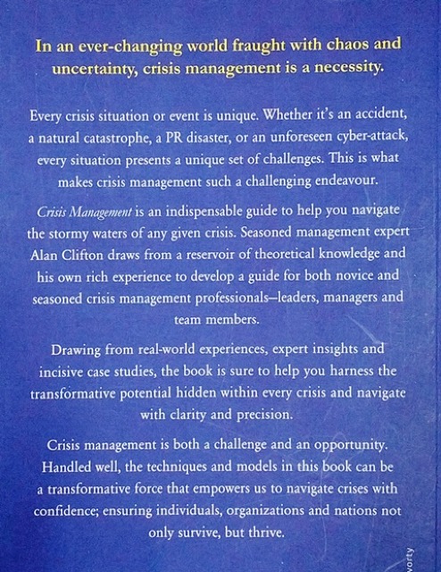 In an ever-changing world fraught with chaos and uncertainty, crisis management is a necessity. Every crisis situation or event is unique. Whether it’s an accident, a natural catastrophe, a PR disaster or an unforeseen cyber-attack, every situation presents a unique set of challenges. This is what makes crisis management such a challenging endeavour. Crisis Management is an indispensable guide to help you navigate the stormy waters of any given crisis. Seasoned management expert Alan Clifton draws from a reservoir of theoretical knowledge and his own rich experience to develop a guide for both novice and seasoned crisis management professionals—leaders, managers and team members. Drawing from real-world experiences, expert insights and incisive case studies, the book is sure to help you harness the transformative potential hidden within every crisis and navigate with clarity and precision. Crisis management is both a challenge and an opportunity. Handled well, the techniques and models in this book can be a transformative force that empowers us to navigate crises with confidence; ensuring individuals, organizations and nations to not only survive, but thrive.