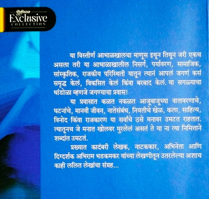 या विस्तीर्ण आभाळखालचा माणूस इथून तिथून जरी एकच असला तरी या आभाळाखालील निसर्ग, पर्यावरण, सामाजिक, सांस्कृतिक, राजकीय परिस्थिती यातून त्यानं आपलं जगणं कसं समृद्ध केलं, विकसित केलं किंवा बरबाद केलं. या सगळ्याचा धांडोळा म्हणजे जगण्याचा प्रवास ! या प्रवासात कळत नकळत आजूबाजूच्या वातावरणाचे, घटनांचे, मानवी जीवन, नातेसंबंध, नियतीचे खेळ, कला, साहित्य, विनोद किंवा राजकारण या सर्वांचे ठसे मनावर उमटत राहतात. त्यातूनच जे मनात खोलवर मुरलेलं असतं ते या ना त्या निमित्ताने शब्दांत उमटतं. प्रख्यात कादंबरी लेखक, नाटककार, अभिनेता आणि दिग्दर्शक अभिराम भडकमकर यांच्या लेखणीतून उतरलेल्या अशाच काही ललित लेखांचा संग्रह...