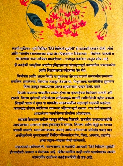 लक्ष्मी मुडेश्वर-पुरी लिखित ‘तिने गिळिले सूर्याशी’ ही कादंबरी म्हणजे प्रीती, शौर्य आणि भारतीय स्वातंत्र्यलढा यांचा तीन पिढ्यांतील स्त्रियांच्या विशेषतः धाडसी व संस्मरणीय तरुण नायिका मालतीच्या नजरेतून घेतलेला अद्भुत शोध आहे. ही कादंबरी आधुनिक भारतीय इतिहासाच्या कोलाहलपूर्ण काळातील उत्साहवर्धक आणि निराशाजनक स्पंदनांचा वेध घेते. निर्भयता आणि अटळ निर्धार या गुणांच्या जोरावर मालती तत्कालीन समाजात प्रचलित असलेल्या, स्त्रियांना जखडून ठेवणाऱ्या, पितृसत्ताक चालीरीतींना झुगारून तिला दडपून टाकण्याचा प्रयत्न करणाऱ्यांना प्रखर विरोध करते उत्कृष्टपणे सांगितलेली, कल्पनारम्य व लक्षवेधी असणारी ‘तिने गिळिले सूर्याशी’ ही कादंबरी अस्सल व रोमांचक आहे. खेरीज मागील काही वर्षात पदार्पणातच अत्यंत संस्मरणीय ठरलेल्या कादंबऱ्यापैकी ती एक आहे.