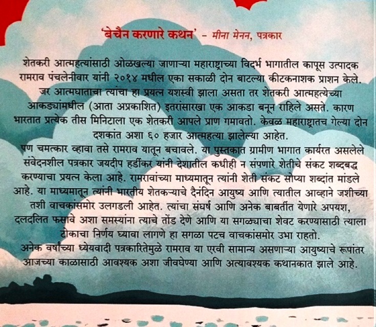 शेतकरी आत्महत्यांसाठी ओळखल्या जाणार्या महाराष्ट्राच्या विदर्भ भागातील कापूस उत्पादक रामराव पंचलेनीवार यांनी २०१४ मधील एका सकाळी दोन बाटल्या कीटकनाशक प्राशन केले. जर आत्मघाताचा त्यांचा हा प्रयत्न यशस्वी झाला असता तर शेतकरी आत्महत्येच्या आकड्यांमधील ( आता अप्रकाशित ) इतरांसारख्या एक आकडा बनून राहिले असते. कारण भारतात प्रत्येक तीस मिनिटाला एक शेतकरी आपले प्राण गमावतो. केवळ महाराष्ट्रातच गेल्या दोन दशकांत अशा ६० हजार आत्महत्या झालेल्या आहेत. पण चमत्कार व्हावा तसे रामराव यातून बचावले. रामरावांच्या माध्यमातून त्यांनी शेती संकट सोप्या शब्दांत मांडले आहे. या माध्यमातून त्यांनी भारतीय शेतकर्याचे दैनंदिन आयुष्य आणि त्यातील आव्हाने जशीच्या तशी वाचकांसमोर उलगडली आहेत. त्यांचा संघर्ष आणि अनेक बाबतींत येणारे अपयश, दलदलित फसावे अशा समस्यांना त्याचे तोंड देणे आणि या सगळ्याचा शेवट करण्यासाठी त्याला टोकाचा निर्णय घ्यावा लागणे हा सगळा पटच वाचकांसमोर उभा राहतो.