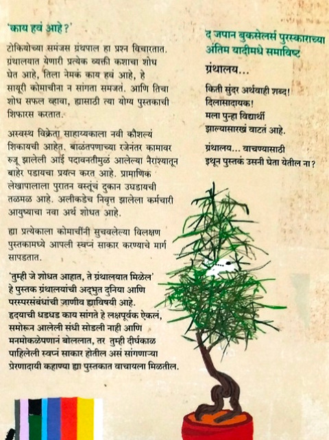 ‘काय हवं आहे?’ टोकियोच्या समंजस ग्रंथपाल हा प्रश्न विचारतात. ग्रंथालयात येणारी प्रत्येक व्यक्ती कशाचा शोध घेत आहे, तिला नेमकं काय हवं आहे, हे सायूरी कोमाचीना न सांगता समजतं. आणि तिचा शोध सफल व्हावा, ह्यासाठी त्या योग्य पुस्तकाची शिफारस करतात. अस्वस्थ विक्रेता साहाय्यकाला नवी कौशल्यं शिकायची आहेत. बाळंतपणाच्या रजेनंतर कामावर रुजू झालेली आई पदावनतीमुळं आलेल्या नैराश्यातून बाहेर पडायचा प्रयत्न करत आहे. प्रामाणिक लेखापालाला पुरातन वस्तूंचं दुकान उघडायची तळमळ आहे. अलीकडेच निवृत्त झालेला कर्मचारी आयुष्याचा नवा अर्थ शोधत आहे. ह्या प्रत्येकाला कोमाचींनी सुचवलेल्या विलक्षण पुस्तकामध्ये आपली स्वप्नं साकार करण्याचे मार्ग सापडतात. ‘तुम्ही जे शोधत आहात, ते ग्रंथालयात मिळेल’ हे पुस्तक ग्रंथालयांची अद्भुत दुनिया आणि परस्परसंबंधांची जाणीव ह्याविषयी आहे. हृदयाची धडधड काय सांगते हे लक्षपूर्वक ऐकलं, समोरून आलेली संधी सोडली नाही आणि मनमोकळेपणानं बोललात, तर तुम्ही दीर्घकाळ पाहिलेली स्वप्नं साकार होतील असं सांगणाऱ्या प्रेरणादायी कहाण्या ह्या पुस्तकात वाचायला मिळतील.