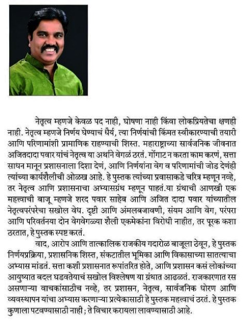 рдЕрдЬрд┐рдд рдкрд╡рд╛рд░ рд╕рд╛рд╣реЗрдмрд╛рдВрдЪреЗ рдЕрддрд┐рд╢рдп рдкреНрд░рднрд╛рд╡реА рд╡реНрдпрдХреНрддрд┐рдорддреНрд╡ рдЖрдгрд┐ рддреНрдпрд╛рдВрдЪреНрдпрд╛ рд╢рд┐рд╕реНрддрдмрджреНрдз рдХрд╛рдорд╛рдЪрд╛ рдЖрдврд╛рд╡рд╛ рдореНрд╣рдгрдЬреЗрдЪ рд╣реЗ рдкреБрд╕реНрддрдХ,рдпреБрд╡рд╛ рдкрд┐рдвреАрд▓рд╛ рдЕрдЬрд┐рдд рджрд╛рджрд╛рдВрд╡рд┐рд╖рдпреА рд╕рдордЬреВрди рдШреЗрдгреНрдпрд╛рд╕рд╛рдареА рд╣реЗ рдкреБрд╕реНрддрдХ рдЕрддреНрдпрдВрдд рдорд╛рд░реНрдЧрджрд░реНрд╢рдХ рдЖрд╣реЗ. рдиреЗрддреГрддреНрд╡ рдореНрд╣рдгрдЬреЗ рдХреЗрд╡рд│ рдкрдж рдирд╛рд╣реА, рдШреЛрд╖рдгрд╛ рдирд╛рд╣реА рдХрд┐рдВрд╡рд╛ рд▓реЛрдХрдкреНрд░рд┐рдпрддреЗрдЪрд╛ рдХреНрд╖рдгрд╣реА рдирд╛рд╣реА. рдиреЗрддреГрддреНрд╡ рдореНрд╣рдгрдЬреЗ рдирд┐рд░реНрдгрдп рдШреЗрдгреНрдпрд╛рдЪрдВ рдзреИрд░реНрдп, рддреНрдпрд╛ рдирд┐рд░реНрдгрдпрд╛рдВрдЪреА рдХрд┐рдВрдордд рд╕реНрд╡реАрдХрд╛рд░рдгреНрдпрд╛рдЪреА рддрдпрд╛рд░реА рдЖрдгрд┐ рдкрд░рд┐рдгрд╛рдорд╛рдВрд╢реА рдкреНрд░рд╛рдорд╛рдгрд┐рдХ рд░рд╛рд╣рдгреНрдпрд╛рдЪреА рд╢рд┐рд╕реНрдд. рдорд╣рд╛рд░рд╛рд╖реНрдЯреНрд░рд╛рдЪреНрдпрд╛ рд╕рд╛рд░реНрд╡рдЬрдирд┐рдХ рдЬреАрд╡рдирд╛рдд рдЕрдЬрд┐рддрджрд╛рджрд╛ рдкрд╡рд╛рд░ рдпрд╛рдВрдЪрдВ рдиреЗрддреГрддреНрд╡ рдпрд╛ рдЕрд░реНрдерд╛рдиреЗ рд╡реЗрдЧрд│рдВ рдард░рддрдВ. рдЧреЛрдВрдЧрд╛рдЯ рди рдХрд░рддрд╛ рдХрд╛рдо рдХрд░рдгрдВ, рд╕рддреНрддрд╛ рд╕рд╛рдзрди рдорд╛рдиреВрди рдкреНрд░рд╢рд╛рд╕рдирд╛рд▓рд╛ рджрд┐рд╢рд╛ рджреЗрдгрдВ, рдЖрдгрд┐ рдирд┐рд░реНрдгрдпрд╛рдВрдирд╛ рд╡реЗрдЧ рд╡ рдкрд░рд┐рдгрд╛рдорд╛рдВрдЪреА рдЬреЛрдб рджреЗрдгрдВрд╣реА рддреНрдпрд╛рдВрдЪреНрдпрд╛ рдХрд╛рд░реНрдпрд╢реИрд▓реАрдЪреА рдУрд│рдЦ рдЖрд╣реЗ. рд╣реЗ рдкреБрд╕реНрддрдХ рддреНрдпрд╛рдВрдЪреНрдпрд╛ рдкреНрд░рд╡рд╛рд╕рд╛рдХрдбреЗ рдЪрд░рд┐рддреНрд░ рдореНрд╣рдгреВрди рдирд╡реНрд╣реЗ, рддрд░ рдиреЗрддреГрддреНрд╡ рдЖрдгрд┐ рдкреНрд░рд╢рд╛рд╕рдирд╛рдЪрд╛ рдЕрднреНрдпрд╛рд╕рдЧреНрд░рдВрде рдореНрд╣рдгреВрди рдкрд╛рд╣рддрдВ. рдпрд╛ рдЧреНрд░рдВрдерд╛рдЪреА рдЖрдгрдЦреА рдПрдХ рдорд╣рддреНрддреНрд╡рд╛рдЪреА рдмрд╛рдЬреВ рдореНрд╣рдгрдЬреЗ рд╢рд░рдж рдкрд╡рд╛рд░ рд╕рд╛рд╣реЗрдм рдЖрдгрд┐ рдЕрдЬрд┐рдд рджрд╛рджрд╛ рдкрд╡рд╛рд░ рдпрд╛рдВрдЪреНрдпрд╛рддреАрд▓ рдиреЗрддреГрддреНрд╡рдкрд░рдВрдкрд░реЗрдЪрд╛ рд╕рдЦреЛрд▓ рд╡реЗрдз. рджреГрд╖реНрдЯреА рдЖрдгрд┐ рдЕрдВрдорд▓рдмрдЬрд╛рд╡рдгреА, рд╕рдВрдпрдо рдЖрдгрд┐ рд╡реЗрдЧ, рдкрд░рдВрдкрд░рд╛ рдЖрдгрд┐ рдкрд░рд┐рд╡рд░реНрддрдирдпрд╛ рджреЛрди рд╡реЗрдЧрд╡реЗрдЧрд│реНрдпрд╛ рд╢реИрд▓реА рдПрдХрдореЗрдХрд╛рдВрдирд╛ рд╡рд┐рд░реЛрдзреА рдирд╛рд╣реАрдд, рддрд░ рдкреВрд░рдХ рдХрд╢рд╛ рдард░рддрд╛рдд, рд╣реЗ рдкреБрд╕реНрддрдХ рд╕реНрдкрд╖реНрдЯ рдХрд░рддрдВ. рд╡рд╛рдж, рдЖрд░реЛрдк рдЖрдгрд┐ рддрд╛рддреНрдХрд╛рд▓рд┐рдХ рд░рд╛рдЬрдХреАрдп рдЧрджрд╛рд░реЛрд│ рдмрд╛рдЬреВрд▓рд╛ рдареЗрд╡реВрди, рд╣реЗ рдкреБрд╕реНрддрдХ рдирд┐рд░реНрдгрдпрдкреНрд░рдХреНрд░рд┐рдпрд╛, рдкреНрд░рд╢рд╛рд╕рдирд┐рдХ рд╢рд┐рд╕реНрдд, рд╕рдВрдХрдЯрд╛рддреАрд▓ рднреВрдорд┐рдХрд╛ рдЖрдгрд┐ рд╡рд┐рдХрд╛рд╕рд╛рдЪреНрдпрд╛ рд╕рд╛рддрддреНрдпрд╛рдЪр