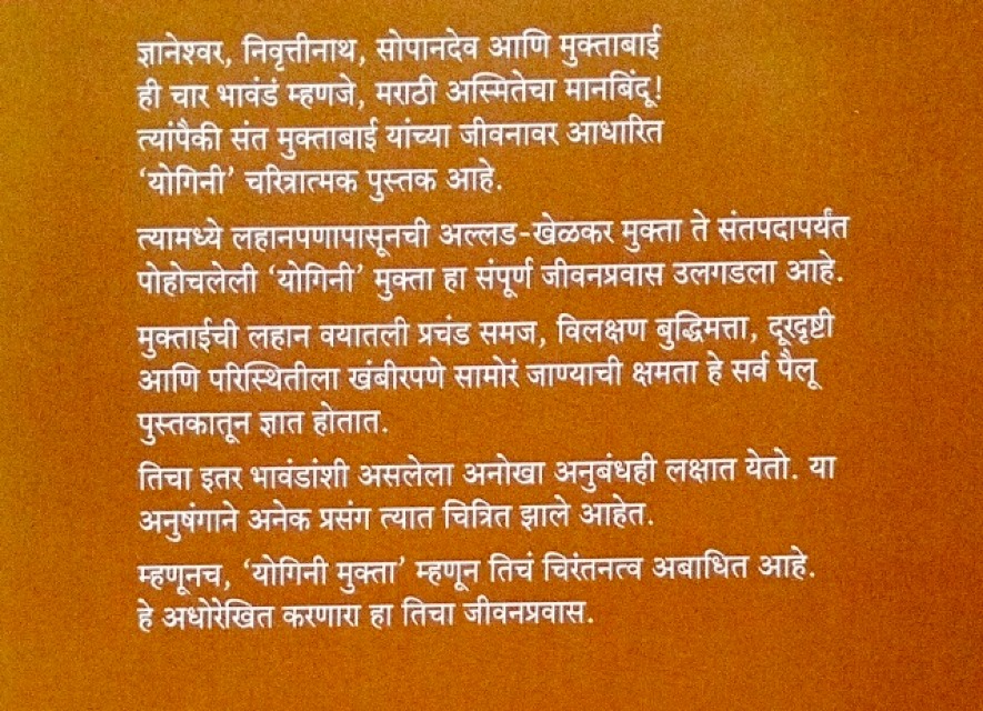 "संत ज्ञानेश्वर, निवृत्तीनाथ, सोपानदेव आणि मुक्ताबाई ही चार भावंडं म्हणजे, मराठी अस्मितेचा मानबिंदू! त्यांपैकी संत मुक्ताबाई यांच्या जीवनावर आधारित ‘योगिनी’ संक्षिप्त चरित्रात्मक पुस्तक आहे. त्यामध्ये लहानपणापासूनची अल्लड-खेळकर मुक्ता ते संतपदापर्यंत पोहोचलेली ‘योगिनी’ मुक्ता हा संपूर्ण जीवनप्रवास उलगडला आहे. या पुस्तकात मुक्ताईचे अनेक स्वभावपैलू आपल्याला उलगडत जातात. तिच्या प्रचंड विद्वत्तेला लाभलेली मायेची झालरही या पुस्तकात चित्रित होते. या अनुषंगाने अनेक प्रसंग त्यात चित्रित झाले आहेत. मुक्ताईची लहान वयातली प्रचंड समज, विलक्षण बुद्धिमत्ता, दूरदृष्टी आणि परिस्थितीला खंबीरपणे सामोरं जाण्याची क्षमता हे सर्व पैलू पुस्तकातून ज्ञात होतात. तिचा इतर भावंडांशी असलेला अनोखा अनुबंधही लक्षात येतो. या सगळ्यांमधूनच ‘संत मुक्ताबाई’पर्यंतचा तिचा जीवनप्रवास तिची खऱ्या अर्थाने ‘योगिनी’ म्हणून ओळख करून देणारा आहे. तसंच, ‘योगिनी मुक्ता’ म्हणून तिचं चिरंतनत्व अबाधित आहे, हे अधोरेखित करणाराही आहे"