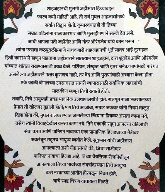 शाहजहानची मुलगी जहाँआरा हिच्याबद्दल फारच कमी माहिती आहे. ती सर्व मुघल शाहजाद्यांमध्ये सर्वांत विद्वान होती. कुमारवयातही ती तिच्या सम्राट वडिलांना राज्यकारभार आणि मुत्सद्दीपणाने सल्ले देत असे. आधी आपला पती जहाँगीर आणि नंतर औरंगजेब यांचे कान भरून त्यांना एखाद्या कठपुतळीप्रमाणे नाचवणारी शाहजहानची धूर्त सावत्र आई नूरमहल हिची कारस्थाने हाणून पाडताना जहाँआराने सातत्याने शाहजहान, दारा शुकोह आणि औरंगजेब यांच्यात शांतता राखण्यासाठी प्रयत्न केले. पर्शियन, संस्कृत आणि इतर अनेक भाषांमध्ये पारंगत असलेल्या जहाँआराने फक्त कुराणच नाही, तर वेद आणि पुराणांचाही अभ्यास केला होता. एके काळी बंगालच्या उपसागरात सागरी व्यापारासाठी सर्वाधिक जहाजांची मालकीण म्हणून तिची ख्याती होती. तथापि, तिचे आयुष्यही प्रचंड भावनिक उलथापालथीचे होते. राजपूत राजा छत्रसालच्या प्रेमात ती खोलवर बुडाली होती; पण तिचे आजोबा, सम्राट अकबर यांनी नियम घालून दिला होता की, मुघल राजघराण्यात जन्मलेल्या स्त्रियांना प्रियकर असता कामा नये, तसेच त्यांनी विवाहदेखील करता कामा नये. तिने एकाकी राहून आपल्या वडिलांची सेवा करत आणि पानिपत नावाच्या एका प्रामाणिक हिजड्याच्या मैत्रीवर अवलंबून राहूनच आयुष्य व्यतीत केले. सुकुमार यांची जहाँआरा आपल्याला अशी गोष्ट सांगते की, जिचा साक्षीदार पानिपत नावाचा हिजडा आहे. तिच्या वैयक्तिक रोजनिशीतून आपल्याला तिच्या भावांच्या संघर्षादरम्यान तिचे आयुष्य कसे नरकाच्या आगीत होरपळून निघत होते, याचे स्पष्ट चित्रण वाचायला मिळते.