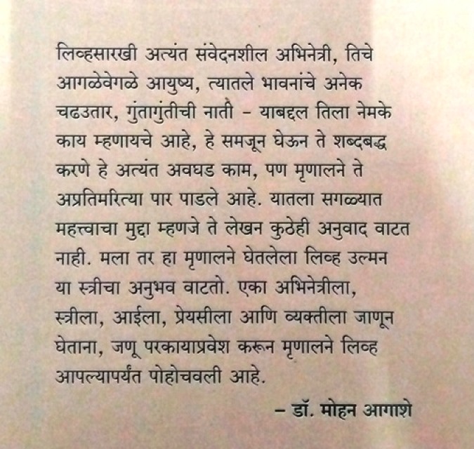 लिव्हसारखी अत्यंत संवेदनशील अभिनेत्री, तिचे आगळेवेगळे आयुष्य, त्यातले भावनांचे अनेक चढउतार, गुंतागुंतीची नाती - याबद्दल तिला नेमके काय म्हणायचे आहे, हे समजून घेऊन ते शब्दबद्ध करणे हे अत्यंत अवघड काम, पण मृणालने ते अप्रतिमरित्या पार पाडले आहे. यातला सगळ्यात महत्त्वाचा मुद्दा म्हणजे ते लेखन कुठेही अनुवाद वाटत नाही. मला तर हा मृणालने घेतलेला लिव्ह उल्मन या स्त्रीचा अनुभव वाटतो. एका अभिनेत्रीला, स्त्रीला, आईला, प्रेयसीला आणि व्यक्तीला जाणून घेताना, जणू परकायाप्रवेश करून मृणालने लिव्ह आपल्यापर्यंत पोहोचवली आहे. - डॉ. मोहन आगाशे
