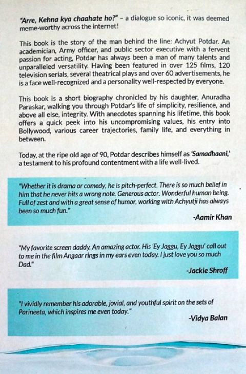 "Arre, Kehna kya chaahate ho?" - a dialogue so iconic, it was deemed meme-worthy across the internet! This book is the story of the man behind the line: Achyut Potdar. An academician, Army officer, and public sector executive with a fervent passion for acting, Potdar has always been a man of many talents and unparalleled versatility. Having been featured in over 125 films, 120 television serials, several theatrical plays and over 60 advertisements, he is a face well-recognized and a personality well-respected by everyone. This book is a short biography chronicled by his daughter, Anuradha Paraskar, walking you through Potdar's life of simplicity, resilience, and above all else, integrity. With anecdotes spanning his lifetime, this book offers a quick peek into his uncompromising values, his entry into Bollywood, various career trajectories, family life, and everything in between. Today, at the ripe old age of 90, Potdar describes himself as 'Samadhaani', a testament to his profound contentment with a life well-lived. Testimonials: "Whether it is drama or comedy, he is pitch-perfect. There is so much belief in him that he never hits a wrong note. Generous actor. Wonderful human being. Full of zest and with a great sense of humor, working with Achyutji has always been so much fun." -Aamir Khan "My favorite screen daddy. An amazing actor. His 'Ey Jaggu, Ey Jaggu' call out to me in the film Angaar rings in my ears even today. I just love you so much Dad." -Jackie Shroff "I vividly remember his adorable, jovial, and youthful spirit on the sets of Parineeta, which inspires me even today." -Vidya Balan