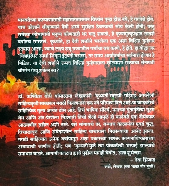 मानवतेच्या कल्याणासाठी महाभारतासमान विध्वंस पुन्हा होऊ नये, हे गरजेचे होते. याच उद्देशाने श्रीकृष्णाने दैवी अस्वे सुरक्षित ठेवण्याची सोय केली होती; परंतु सत्तेच्या लोभापायी मनुष्य कोणताही थर गाठू शकतो, हे कृष्णमृत्यूपश्चात सातशे वर्षातच समजले. कृथ्यति, हा दैवी शक्तीने भरलेला एक असा विक्षिप्त गुन्हेगार उठ्यास आला, ज्याचे लक्ष्य शत्रू राज्यातील गर्भाचा वध करणे, हे होते. हा योद्धा जर 'विद्यधुरंधर स्पर्धा जिंकून इंद्रपदी बसला, तर समग्र आर्यावर्ताचा सर्वनाश होणार हे निक्षित. या दैवी शक्तीने उन्मत्त विक्षिप्त गुन्हेगाराला छोट्याशा राज्याचा सेनापती वीरसेन रोखू शकेल का? डॉ. ऋषिकेश बोधे यांसारख्या लेखकांनी 'कृथ्यती'सारखी गहिराई असलेली साहित्यकृती साकारून मराठी फिक्शनला एक नवे परिमाण दिले आहे. या कादंबरीचे साहित्यिक मूल्य अत्यंत ठोस आहे. तिचं भाषिक सौंदर्य, मनाच्या गुंतागुंतीचा सुक्ष्म येध आणि अंतःप्रेरणेला भिडणारी तिची शैली यामुळे ही कादंबरी एक दीर्घकाळ आठवणीत राहील अशी ठरते. खरे सांगायचे तर, बऱ्याच काळानंतर एवढं शुद्ध, विचारप्रवृत्त आणि संवेदनशील साहित्य वाचायला मिळाल्याचा आनंद झाला. मराठी साहित्यात अनेक वर्षापासून अशा प्रकारच्या सशक्त कल्पनाविष्काराच्या अभावाची जाणीव होती; पण 'कृध्यती मुळे त्या पोकळीची भरपाई झाल्याचे समाधान वाटते. आगामी काळात ह्याचे पुढील भागही येवोत, अशा शुभेच्छा.