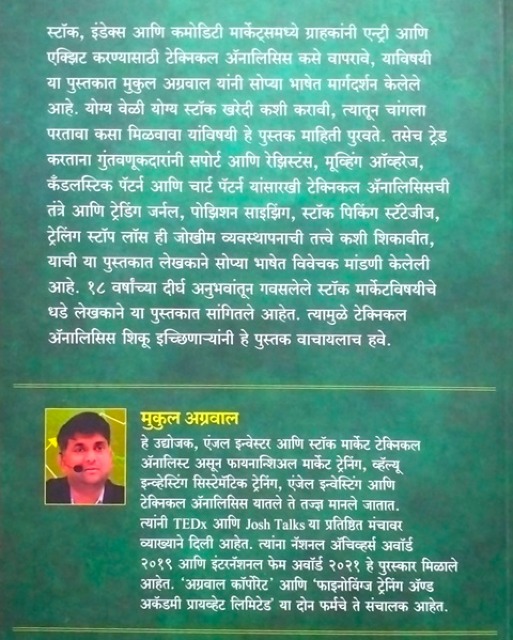 “Finowings Training & amp; Academy Pvt Ltd” ने संस्थापक, मुकुल अग्रवाल यांनी लिहिलेले हे पुस्तक, स्टॉक, इंडेक्स आणि कमोडिटी मार्केट्समध्ये तुमची एंट्री, एक्झिट आणि एक्झिट करण्यासाठी टेक्निकल अनिलिसिस कसे वापरावे हे स्पष्ट करण्यासाठी मार्गदर्शक म्हणून काम करते. मी जे काही शिकलो ते आणि गेल्या 18 वर्षात या मार्केटमधून अनुभवलेले, मी तुम्हाला या पुस्तकाच्या माध्यमातून सोप्या भाषेत समजावून सांगण्याना प्रयत्न केला आहे. ज्यांना टेक्निकल ऑनलिसिस शिकायचे आहे त्यांनी हे पुस्तक वाचायला हवे. कारण या पुस्तकाची लेखन शैली सहज समजण्याजोगी आहे. हे पुस्तक ट्रेडर्स किंवा गुंतवणूकदारांना अशी सर्व मूलभूत आणि जटिल तंत्रे सोप्या पद्धतीने समजावून सांगेल जी त्यांना टेक्निकल ऑनेलिसिस समजून घेण्यासाठी आवश्यक असतील आणि हे पुस्तक वाचल्याने हे ट्रेडर्स किंवा गुंतवणूकदारांना योग्य वेळी योग्य स्टॉक खरेदी करण्याचा पर्याय निवडण्यात देखील उपयुक्त ठरेल जेणेकरून त्यांना त्यांच्या स्टॉकमधून चांगला परतावा मिळू शकेल. यामध्ये समाविष्ट असलेली विविध उदाहरणे ट्रेडर्स किंवा गुंतवणूकदारांना ट्रेड करताना सपोर्ट आणि रेझिस्टंस, मूव्हिंग ऑव्हरेज, कैंडलस्टिक पॅटर्न आणि चार्ट पॅटर्न इत्यादी सारखी विविध टेक्निकल ऑनलिसिसनी तंत्र समजून घेण्यास आणि ती लागू करण्यासाठी योग्य दिशेने मार्गदर्शन करतील. या व्यतिरिक्त, या पुस्तकामध्ये ट्रेडिंग जर्नलसह पोझिशन साइडिटंग, स्टॉक पिकिंग स्ट्रेटेजीज, आद्याक्षरे सेट अप करणे आणि ट्रेलिंग स्टॉप लॉस यासारख्या जोखीम व्यवस्थापनाचा समावेश आहे.