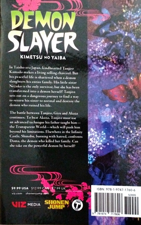 Tanjiro sets out on the path of the Demon Slayer to save his sister and avenge his family!In Taisho-era Japan, kindhearted Tanjiro Kamado makes a living selling charcoal. But his peaceful life is shattered when a demon slaughters his entire family. His little sister Nezuko is the only survivor, but she has been transformed into a demon herself! Tanjiro sets out on a dangerous journey to find a way to return his sister to normal and destroy the demon who ruined his life.The battle between Tanjiro, Giyu and Akaza continues. To beat Akaza, Tanjiro must use an advanced technique his father taught him—the Transparent World—which will push him beyond his limitations. Elsewhere in the Infinity Castle, Shinobu, burning with hatred, confronts Doma, the demon who killed her family. Can she take on the powerful demon by herself?