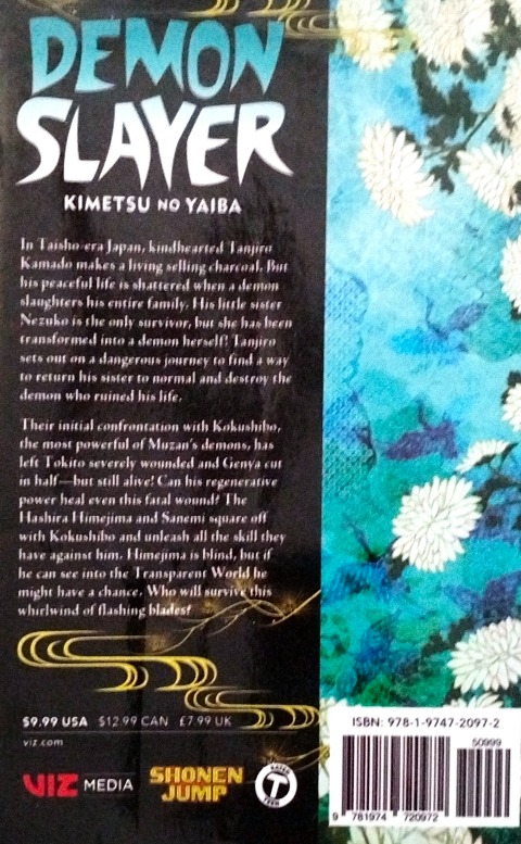 Tanjiro sets out on the path of the Demon Slayer to save his sister and avenge his family!In Taisho-era Japan, kindhearted Tanjiro Kamado makes a living selling charcoal. But his peaceful life is shattered when a demon slaughters his entire family. His little sister Nezuko is the only survivor, but she has been transformed into a demon herself! Tanjiro sets out on a dangerous journey to find a way to return his sister to normal and destroy the demon who ruined his life.Their initial confrontation with Kokushibo, the most powerful of Muzan’s demons, has left Tokito severely wounded and Genya cut in half—but still alive! Can his regenerative power heal even this fatal wound? The Hashira Himejima and Sanemi square off with Kokushibo and unleash all the skill they have against him. Himejima is blind, but if he can see into the Transparent World he might have a chance. Who will survive this whirlwind of flashing blades?