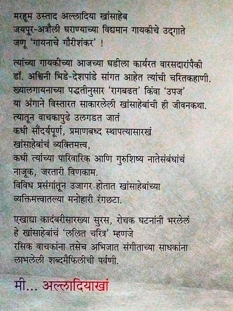 मरहूम उस्ताद अल्लादिया खांसाहेब जयपूर-अत्रौली घराण्याच्या विद्यमान गायकीचे उद्गाते जणू ‘गायनाचे गौरीशंकर' ! त्यांच्या गायकीच्या आजच्या घडीला कार्यरत वारसदारांपैकी डॉ. अश्विनी भिडे-देशपांडे सांगत आहेत त्यांची चरितकहाणी. ख्यालगायनाच्या पद्धतीनुसार ‘रागबढत' किंवा ‘उपज' या अंगाने विस्तारत साकारलेली खांसाहेबांची ही जीवनकथा. त्यातून वाचकापुढे उलगडत जातं कधी सौंदर्यपूर्ण, प्रमाणबध्द स्थापत्यासारखं खांसाहेबांचं व्यक्तिमत्त्व, कधी त्यांच्या पारिवारिक आणि गुरुशिष्य नातेसंबंधांचं नाजूक, जरतारी विणकाम. विविध प्रसंगांतून उजागर होतात खांसाहेबांच्या व्यक्तिमत्त्वातल्या मनोहारी रंगछटा. एखाद्या कादंबरीसारख्या सुरस, रोचक घटनांनी भरलेलं हे खांसाहेबांचं ‘ललित चरित्र' म्हणजे रसिक वाचकांना तसेच अभिजात संगीताच्या साधकांना लाभलेली शब्दमैफिलीची पर्वणी.