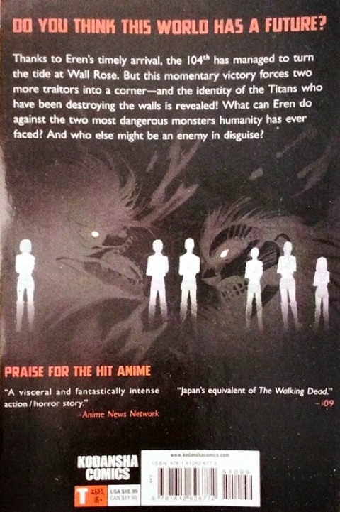 DO YOU THINK THIS WORLD HAS A FUTURE? Thanks to Eren's timely arrival, the 104th has managed to turn the tide at Wall Rose. But this momentary victory forces two more traitors into a corner - and the identity of the Titans who have been destroying the walls is revealed! What can Eren do against the two most dangerous monsters humanity has ever faced? And who else might be an enemy in disguise? ? PRAISE FOR THE HIT ANIME "A visceral and fantastically intense action/horror story." - Anime News Network ? "Japan's equivalent of The Walking Dead." - io9