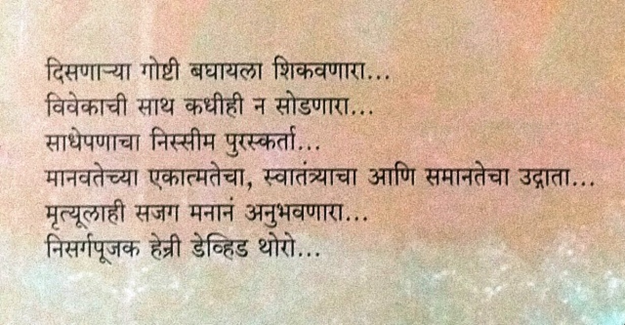 द्रष्टा - वीणा गवाणकर दिसणाऱ्या गोष्टी बघायला शिकवणारा... विवेकाची साथ कधीही न सोडणारा... साधेपणाचा निस्सीम पुरस्कर्ता... मानवतेच्या एकात्मतेचा, स्वातंत्र्याचा आणि समानतेचा उद्गाता... मृत्यूलाही सजग मनानं अनुभवणारा... निसर्गपूजक हेन्री डेव्हिड थोरो