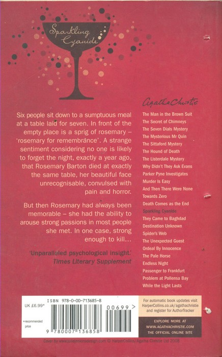 Six people sit down to a sumptuous meal at a table laid for seven. A sprig of rosemary -- 'rosemary for remembrance' -- marks the empty place. It is the first anniversary of the horrific death by cyanide-laced champagne of the beautiful and troublesome Rosemary Barton. The assembled guests are the same participants at the meal a year prior, and Rosemary's widower, George Barton, is determined to prove that one of them is a murderer. But George's dinner party, and his plans for justice, will go terribly awry, as another death will come to haunt this date.