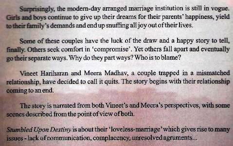 Surprisingly the modernday arranged marriage institutions still in vogue. Girls and boys continue to give up their dreams for their parents happiness, yield to their familys demands and end up snuffing all joy out of their lives. Some of these couples have the luck of the draw and a happy story to tell, finally. Others seek comfort in compromise. Yet others fall apart and eventually go their separate ways. Why do they part ways? Who is to blame? Vineet Hariharan and Meera Madhav, a couple trapped in a mismatched relationship, have decided to call it quits. The story begins with their relationship coming to an end. The story in narrated from both Vineets and Meeras perspectives, with some scenes described from the point of view of both. Stumbled Upon Destiny is about their lovelessmarriage which gives rise to many issue lack of communication, complacency, unresolved agruments