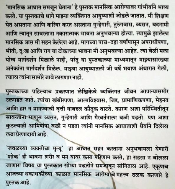 'рдорд╛рдирд╕рд┐рдХ рдЖрдШрд╛рдд рд╕рдордЬреВрди рдШреЗрддрд╛рдирд╛' рд╣реЗ рдкреБрд╕реНрддрдХ рдорд╛рдирд╕рд┐рдХ рдЖрд░реЛрдЧреНрдпрд╛рд╡рд░ рдЧрд╛рдВрднреАрд░реНрдпрд╛рдиреЗ рднрд╛рд╖реНрдп рдХрд░рддреЗ. рдпрд╛ рдкреБрд╕реНрддрдХрд╛рдЪреЗ рдзрд╛рдЧреЗ рдорд╛рдЭреНрдпрд╛ рд╡реНрдпрдХреНрддрд┐рдЧрдд рдЖрдпреБрд╖реНрдпрд╛рд╢реА рдЬреЛрдбрд▓реЗ рдЬрд╛рддрд╛рдд. рдореА рд╢рд┐рдХреНрд╖рдг рдШреЗрдд рдЕрд╕рддрд╛рдирд╛ рдЖрдгрд┐ рдХрд░рд┐рдпрд░ рдХрд░рдд рдЕрд╕рддрд╛рдирд╛ рдЧреБрдиреНрд╣реЗрдЧрд╛рд░реА, рддреБрд░реБрдВрдЧрд╡рд╛рд╕, рд╡реНрдпрд╕рди, рдмрджрдирд╛рдореА рдЖрдгрд┐ рддреНрдпрд╛рддреВрди рд╕рд╛рд╡рд░рддрд╛рдирд╛ рдирдХрд╛рд░рд╛рддреНрдордХ рднрд╛рд╡рдирд╛ рдЕрдиреБрднрд╡рд▓реНрдпрд╛ рд╣реЛрддреНрдпрд╛. рддреНрдпрд╛рдореБрд│реЗ рдЭрд╛рд▓реЗрд▓рд╛ рдорд╛рдирд╕рд┐рдХ рддреНрд░рд╛рд╕ рдореА рд╕рд╣рди рдХреЗрд▓реЗрд▓рд╛ рдЖрд╣реЗ. рдорд╛рдЧрдЪреНрдпрд╛ рдкрд╛рдЪ-рджрд╣рд╛ рд╡рд░реНрд╖рд╛рдВрдкрд╛рд╕реВрди рдЕрдкрд░рд╛рдзреАрдкрдгрд╛, рднреАрддреА, рджреБрдГрдЦ рдЖрдгрд┐ рд░рд╛рдЧ рдпрд╛ рдЯреЛрдХрд╛рдЪреНрдпрд╛ рднрд╛рд╡рдирд╛ рдореА рдЕрдиреБрднрд╡рд▓реНрдпрд╛ рдЖрд╣реЗрдд. рддреНрдпрд╛ рд╡реЗрд│реА рдорд▓рд╛ рдпреЛрдЧреНрдп рдорд╛рд░реНрдЧрджрд░реНрд╢рди рдорд┐рд│рд╛рд▓реЗ рдирд╛рд╣реА, рдкрд░рдВрддреБ рдпрд╛ рдкреБрд╕реНрддрдХрд╛рдЪреНрдпрд╛ рдорд╛рдзреНрдпрдорд╛рддреВрди рдорд╛рдЭреНрдпрд╛рд╕рд╛рд░рдЦреНрдпрд╛ рдЕрдиреЗрдХрд╛рдВрдирд╛ рдорд╛рд░реНрдЧрджрд░реНрд╢рди рдорд┐рд│реЗрд▓. рдорд╛рдЭреНрдпрд╛ рдЖрдпреБрд╖реНрдпрд╛рддрд▓реА рдЬреА рд╡рд░реНрд╖реЗ рднрдпрд╛рдг рдЕрдВрдзрд╛рд░рд╛рдд рдЧреЗрд▓реА, рддреНрдпрд╛рд▓рд╛ рддреНрдпрд╛рдВрдирд╛ рд╕рд╛рдореЛрд░реЗ рдЬрд╛рд╡реЗ рд▓рд╛рдЧрдгрд╛рд░ рдирд╛рд╣реА. рдкреБрд╕реНрддрдХрд╛рдЪреНрдпрд╛ рдкрд╣рд┐рд▓реНрдпрд╛рдЪ рдкреНрд░рдХрд░рдгрд╛рдд рд▓реЗрдЦрд┐рдХреЗрдЪреЗ рд╡реНрдпрдХреНрддрд┐рдЧрдд рдЬреАрд╡рди рдЖрдкрд▓реНрдпрд╛рд╕рдореЛрд░ рдЙрд▓рдЧрдбрдд рдЬрд╛рддреЗ. рддреНрдпрд╛рдВрдЪрд╛ рдЦрдВрдмреАрд░рдкрдгрд╛, рдЖрддреНрдорд╡рд┐рд╢реНрд╡рд╛рд╕, рдЬрд┐рджреНрдж, рдкреНрд░рд╛рдорд╛рдгрд┐рдХрдкрдгрд╛, рдореЗрд╣рдирдд рдЖрдгрд┐ рд╣рд╛рд░ рди рдорд╛рдирдгреНрдпрд╛рдЪреА рд╡реГрддреНрддреА рдпрд╛рдмрджреНрджрд▓ рдХреМрддреБрдХ рд╡рд╛рдЯрддреЗ. рдХрд╛рд░рдг рдЕрд╢рд╛ рдкрд░рд┐рд╕реНрдерд┐рддреАрддреВрди рд╕рд╛рд╡рд░рддрд╛рдирд╛ рдорд╛рдгреВрд╕ рд╡реНрдпрд╕рди, рдЧреБрдиреНрд╣реЗрдЧрд╛рд░реА рдЖрдгрд┐ рдЧреИрд░рд╡рд░реНрддрдирд╛рд▓рд╛ рдмрд│реА рдкрдбрддреЛ. рдкрдг рдЕрд╢рд╛ рдХреБрдард▓реНрдпрд╛рд╣реА рдЖрдорд┐рд╖рд╛рдВрдирд╛ рдмрд│реА рди рдкрдбрддрд╛ рддреНрдпрд╛рдВрдиреА рдорд╛рдирд╕рд┐рдХ рдЖрдШрд╛рддрд╛рд╢реА рдзреИрд░реНрдпрд╛рдиреЗ рджрд┐рд▓реЗрд▓рд╛ рд▓рдврд╛ рдкреНрд░реЗрд░рдгрд╛рджрд╛рдпреА рдЖрд╣реЗ. 'рдЬрд╡рд│рдЪреНрдпрд╛ рд╡реНрдпрдХреНрддреАрдЪрд╛ рдореГрддреНрдпреВ' рд╣рд╛ рдЖрдШрд╛рдд рд╕рд╣рди рдХрд░рддрд╛рдирд╛ рдЕрдиреБрднрд╡рд╛рдпрд▓рд╛ рдпреЗрдгрд╛рд░реА 'рд╢реЛрдХ' рд╣реА рднрд╛рд╡рдирд╛ рд╢рд░реАрд░ рд╡ рдорди рдпрд╛рд╡рд░ рдХрд╕рд╛ рдкрд░рд┐рдгрд╛рдо рдХрд░рддреЗ, рд╣рд╛ рд╕рд╣рд╕рд╛ рди рдмреЛрд▓рд▓
