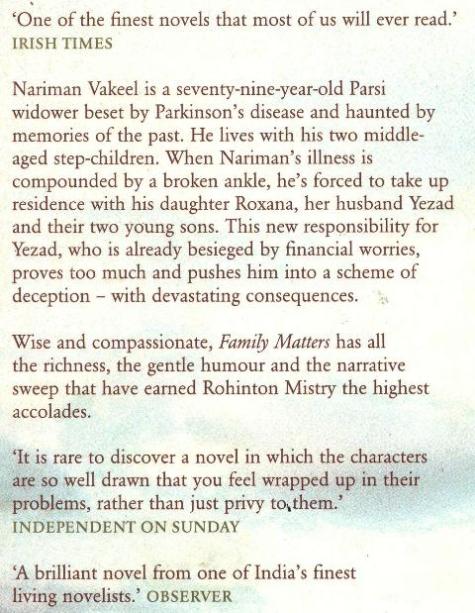 Nariman Vakeel is a seventy-nine-year-old Parsi widower beset by Parkinson's disease and haunted by memories of the past. He lives with his two middle-aged step-children. When Nariman's illness is compunded by a broken ankle, he's forced to take up residence with his daughter Roxana, her husband Yezad and their two young sons. This new responsibility for Yezad, who is already besieged by financial worries, proves too much and pushes him into a scheme of deception - with devastating consequences. Wise and compassionate, Family Matters has all the richness, the gentle humour and the narrative sweep that have earned Rohinton Mistry the highest accolades.