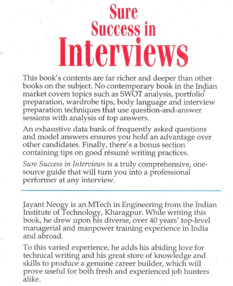 An interview is a necessary component after a written examination. During an interview, an effective presentation can always tilt the balance in your favour. To make you a winner, this book brings you many sure-shot tips and topics never offered before by any contemporary book. About the Author Jayant Neogy is an MTech in Engineering from the Indian Institute of Technology, Kharagpur. While writing this book, he drew upon his diverse over 40 years' top-level managerial and manpower training experience in India and abroad. To this varied experience he adds his abiding love for technical writing and his great store of knowledge and skills to produce a genuine career builder, which will prove useful for both fresh and experienced job hunters alike.