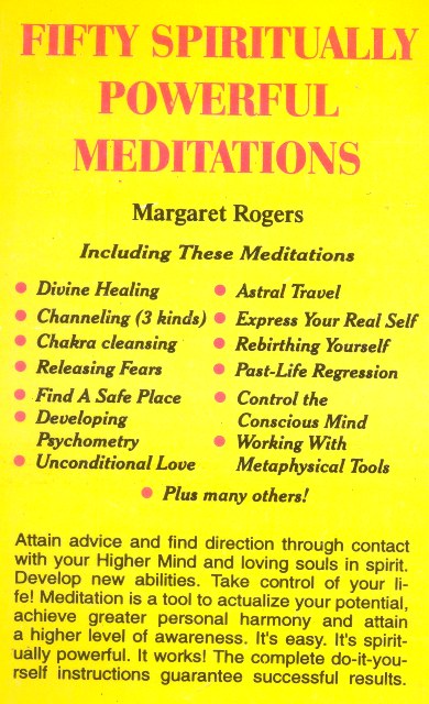 Attain advice and find direction through contact with your higher mind and loving souls in spirit. Develop new abilities. Take control of your life! The 50 spiritually powerful meditations in this book will assist you in gaining awareness of your true nature. This awareness will attune, unify and focus all your powers and energies. The author Margaret Rogers advocates personal and spiritual development as the key to success. Divine Healing, Channeling (3 kinds), Chakra Cleansing, Releasing Fears, Control of Conscious Mind, Working with Tools…. these are few names of the meditations included in this book.