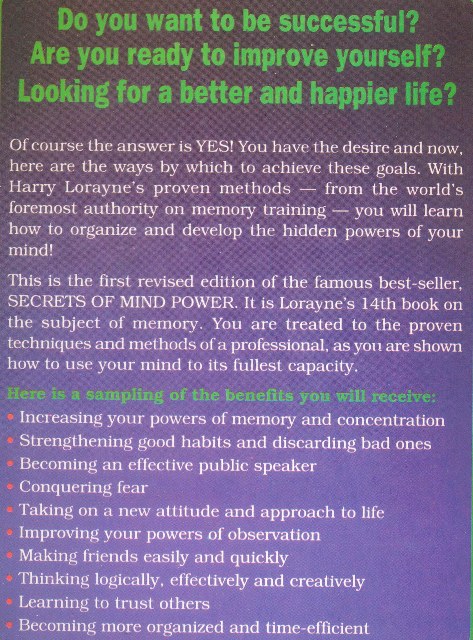 Do you want to be successful? Are you ready to improve yourself? Are you looking for a better and happier life? Of course, your answer would be: Yes. Then read the Secrets Of Mind Power and learn the ways which will tell you how to achieve those goals. The book enlightens you in many ways. Through it you are introduced to the personal techniques and methods of a professional, as you are shown how to use your mind to its fullest capacity. The benefits you will receive from it are: Conquer fear.Become an effective public speaker.Take a new attitude & approach to life.Increase your powers of memory & concentration.Learn to think logically, effectively and creatively.Learn to trust others.Become more organized & time efficient.