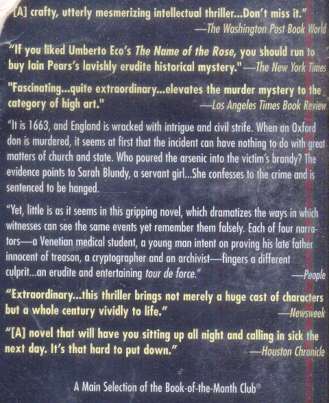 ook Summary of An Instance of the Fingerpost In 1663 Oxford, a servant girl confesses to a murder. But four witnesses -- a medical student, the son of a traitor, a cryptographer, and an archivist -- each finger a different culprit...