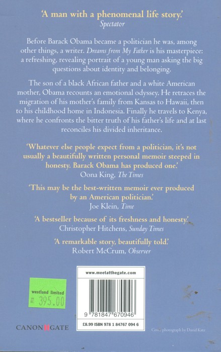 The son of a black African father and a white American mother, Obama was only two years old when his father walked out on the family. Many years later, Obama receives a phone call from Nairobi: his father is dead. This sudden news inspires an emotional odyssey for Obama, determined More... to learn the truth of his father's life and reconcile his divided inheritance. Written at the age of thirty-three, dreams from my Father is an unforgettable read. It illuminates not only Obama's journey, but also our universal desire to understand our history, and what makes us the people we are.