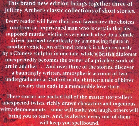 A collected edition of the master storyteller's short stories This brand new edition brings together three of Jeffrey Archer’s classic collections of short stories. Every reader will have their own favourites: the choices run from an imprisoned man who is certain that his supposed murder victim is very much alive, to a female driver pursued relentlessly by a menacing figure in another vehicle. An offhand remark is taken seriously by a Chinese sculptor in one tale, while a British diplomat unexpectedly becomes the owner of a priceless work of art in another . . . And over three of the stories, discover a hauntingly written, atmospheric account of two undergraduates at Oxford in the thirties: a tale of bitter rivalry that ends in a memorable love story. These stories are packed full of the master storyteller’s unexpected twists, richly drawn characters and ingenious, witty denouements – some will make you laugh, others will bring you to tears. And, as always, every one of them will keep you spellbound.